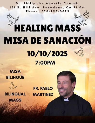 The Healing Mass for this month will be bilingual with Fr. Pablo at 7pm on Friday, October 10. Individual prayer teams will be available after Mass.