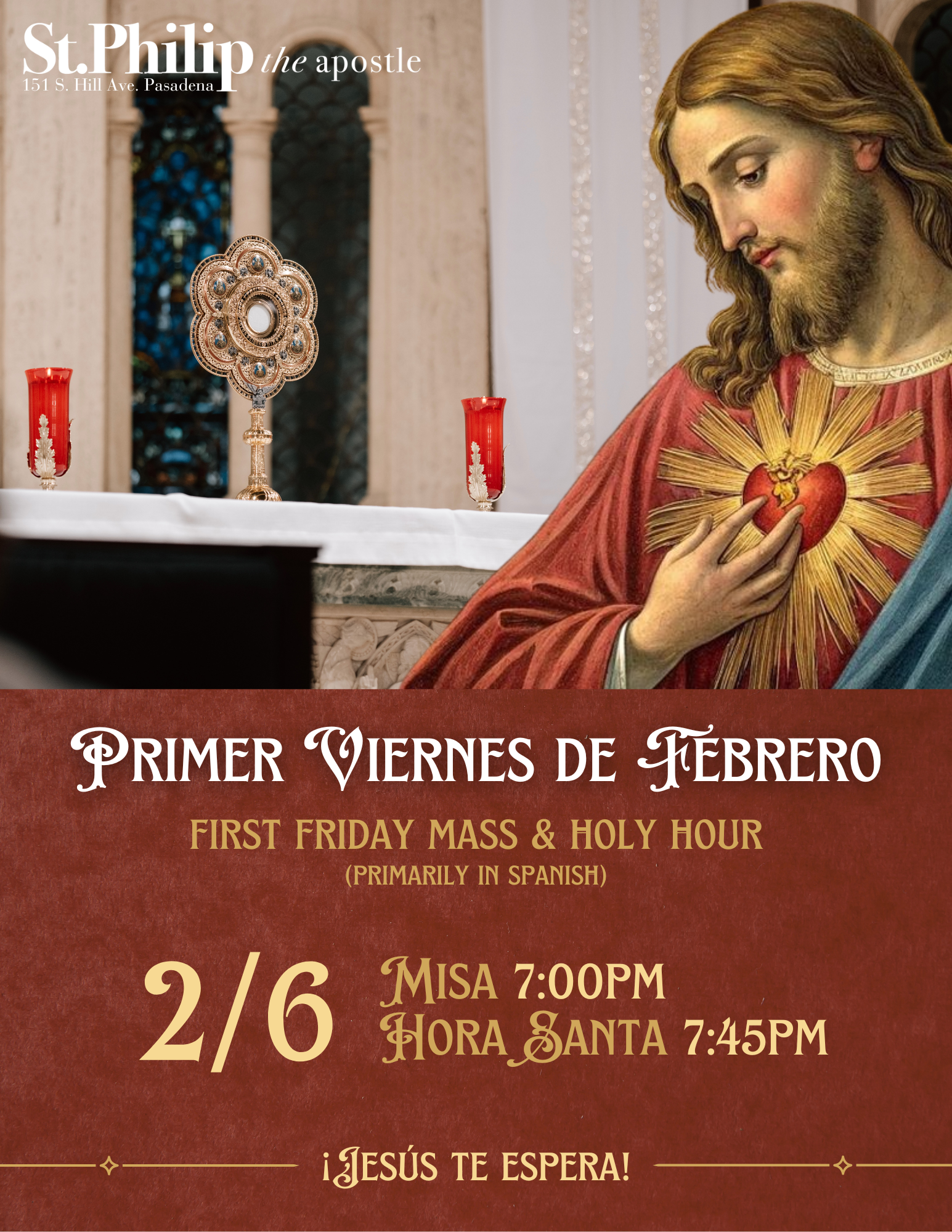This coming Friday, February 6, we will have the First Friday Mass and Holy Hour in honor of the Sacred Heart of Jesus, celebrated primarily in Spanish. Mass will be at 7:00 p.m., followed by Holy Hour at 7:45 p.m. Jesus is waiting for you.