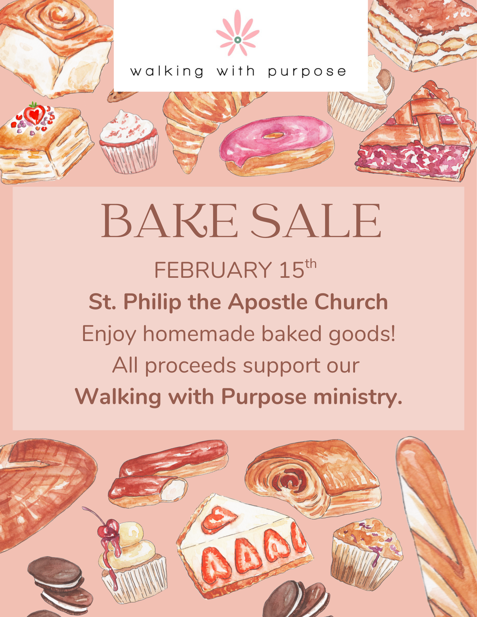 Next Sunday, join us for a Bake Sale on February 15th and enjoy homemade treats while supporting our Walking with Purpose ministry.