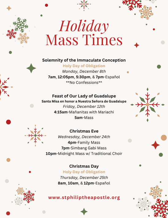 Todos están invitados a la cena anual en honor a la Virgen de Guadalupe. Los boletos estarán a la venta después de la misa de las 12:30 p.m. los domingos.