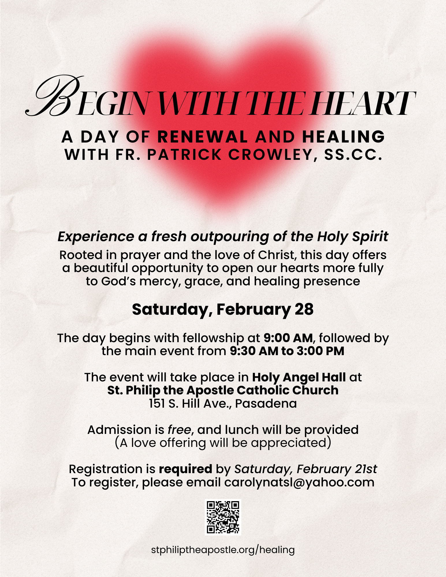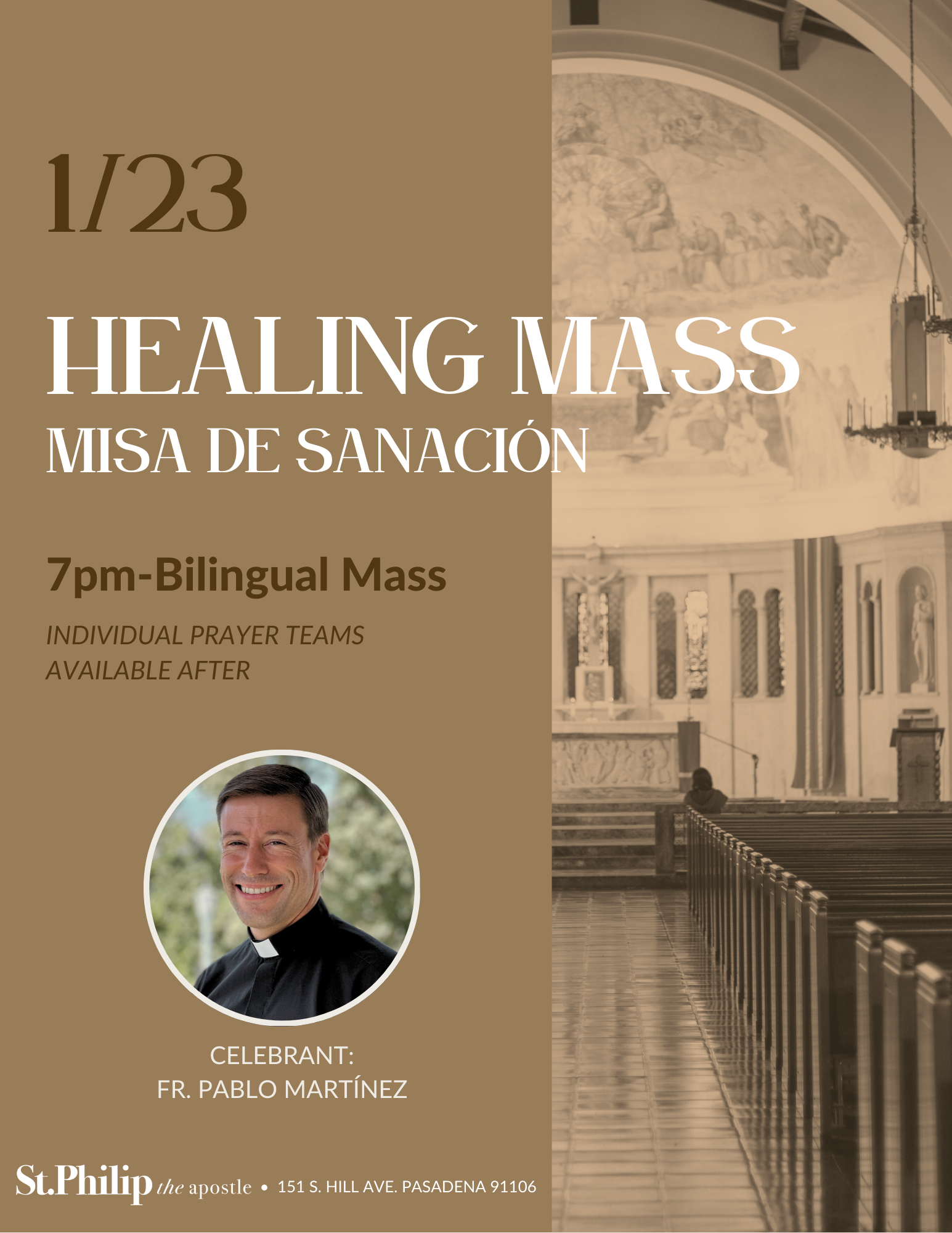 Join us on 1/23 at 7pm for a bilingual Healing Mass with individual prayer teams available afterward.