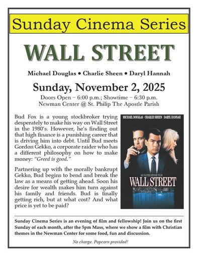The SUNDAY CINEMA SERIES returns with a showing of Wall Street starring Michael Douglas and Charlie Sheen. This Academy Award-winning film film explores the nature of greed in the world of high finance. Join us in the Parish Center. A discussion will follow and popcorn is provided.