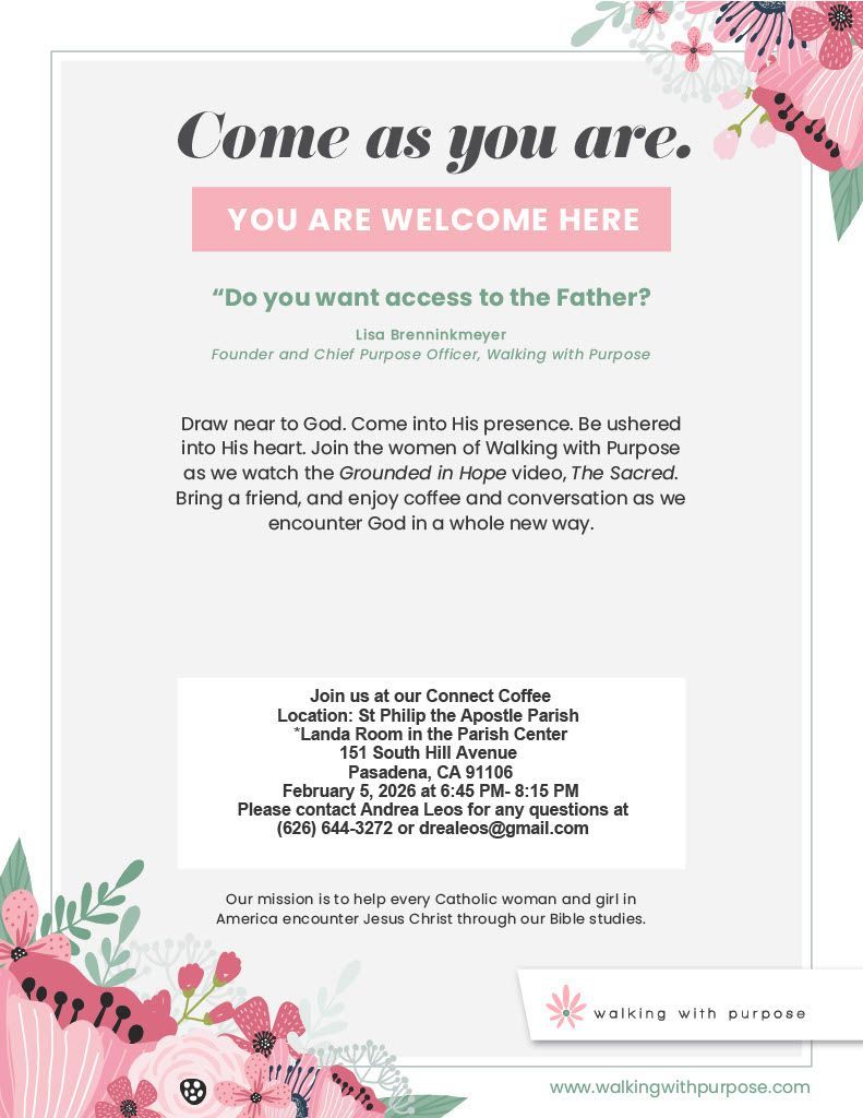 Women are invited to join Walking with Purpose on Thursday, February 5, inside the Landa Room for a Connect Coffee to watch a faith video and share conversation.