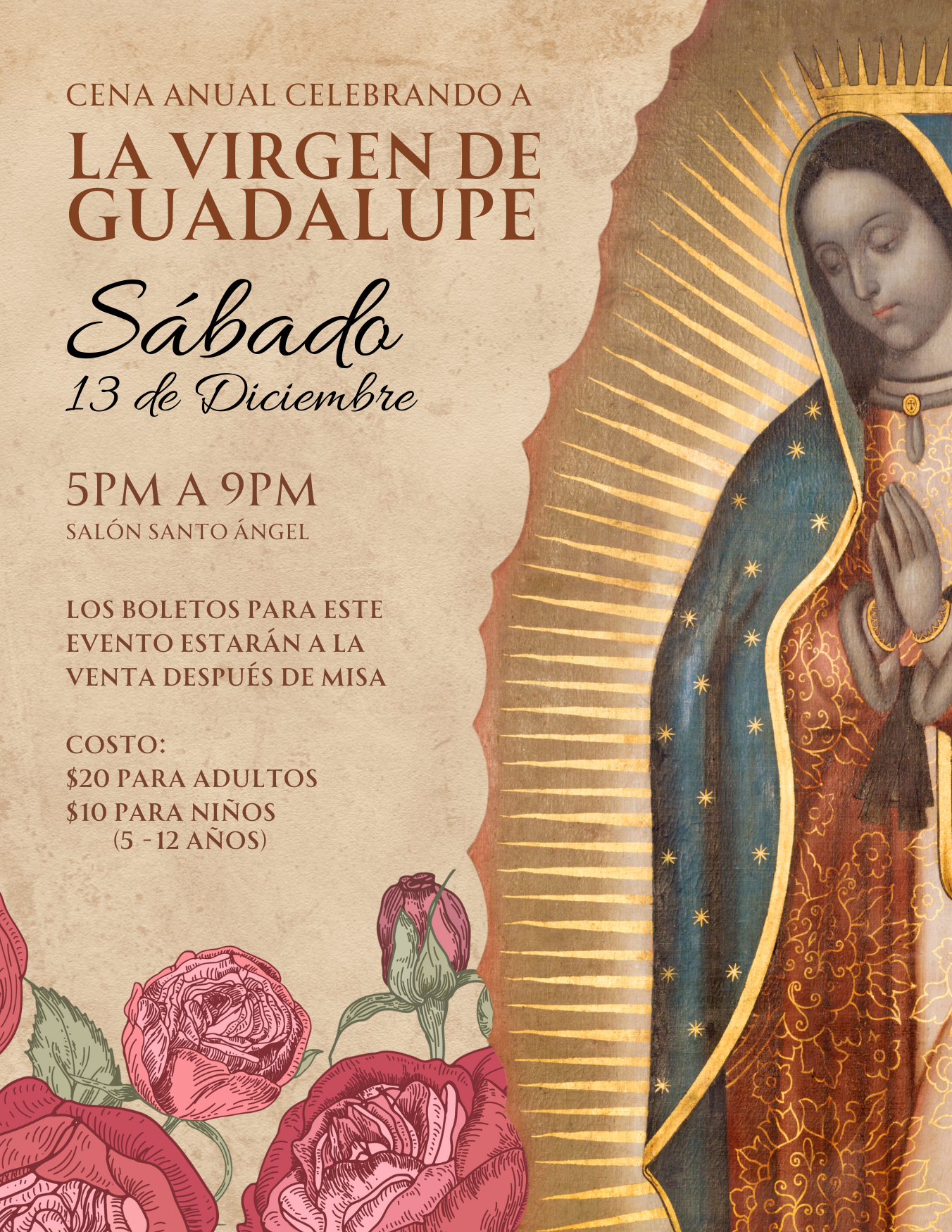Todos están invitados a la cena anual en honor a la Virgen de Guadalupe. Los boletos estarán a la venta después de la misa de las 12:30 p.m. los domingos.