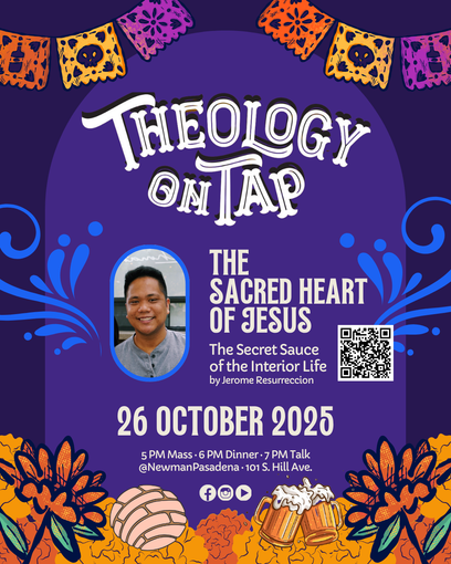 Young adults 21+ are invited to Theology on Tap this Sunday, October 26 at the Newman Center! Jerome Resurreccion will give a talk on The Sacred Heart of Jesus: The Secret Sauce of the Interior Life, with drinks, community, and good conversation.