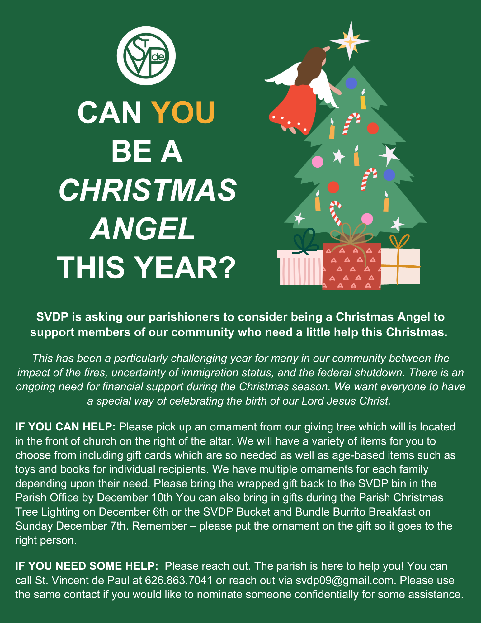 Parishioners are invited to become “Christmas Angels” by picking up an ornament and donating gifts to community members in need through the SVDP holiday giving program.
