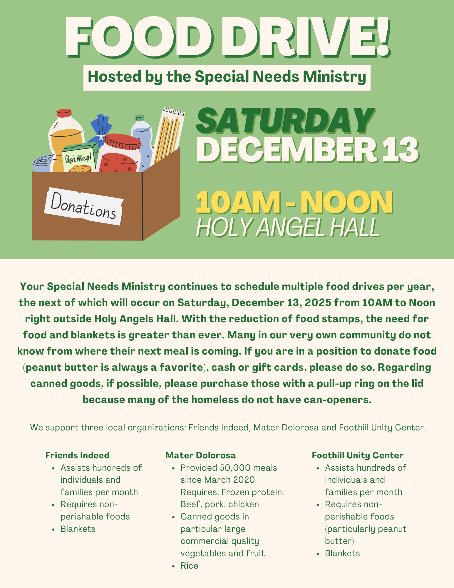Join our Special Needs Ministry us on December 13th for a community food drive supporting local families in need at Holy Angel Hall.