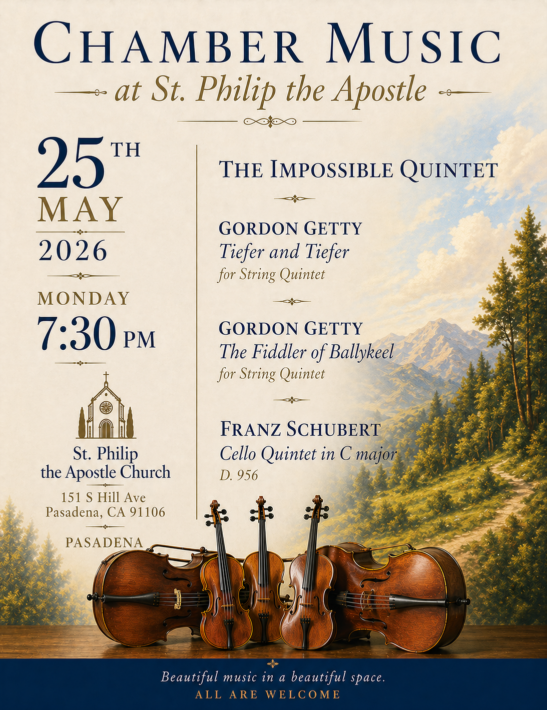 Sacred music has always been at the heart of the Church’s prayer, lifting the soul to God and drawing us more deeply into His presence. At St. Philip the Apostle, we are honored to host concerts that reflect the beauty, reverence, and richness of this tradition—offering an encounter with music that not only delights the ear, but also elevates the spirit.