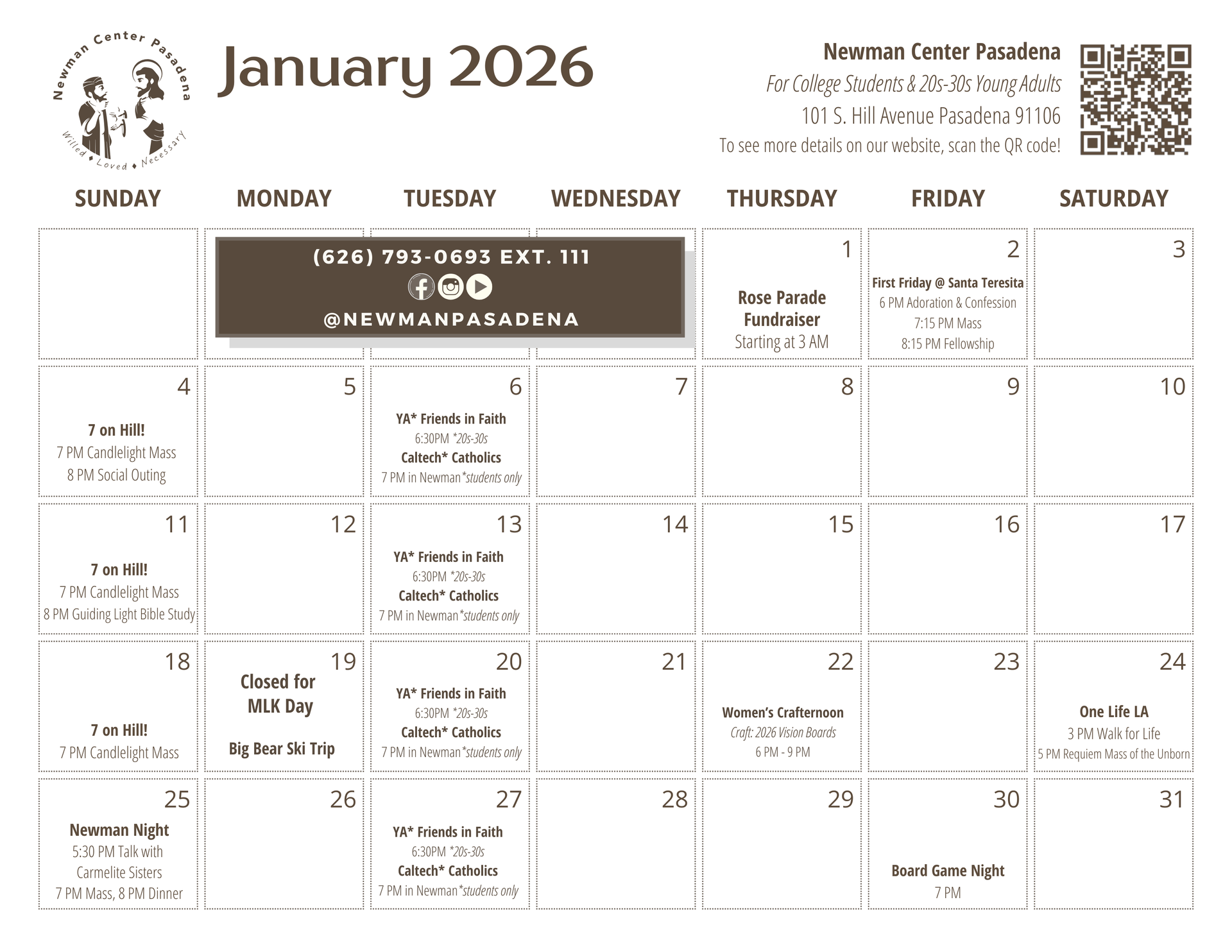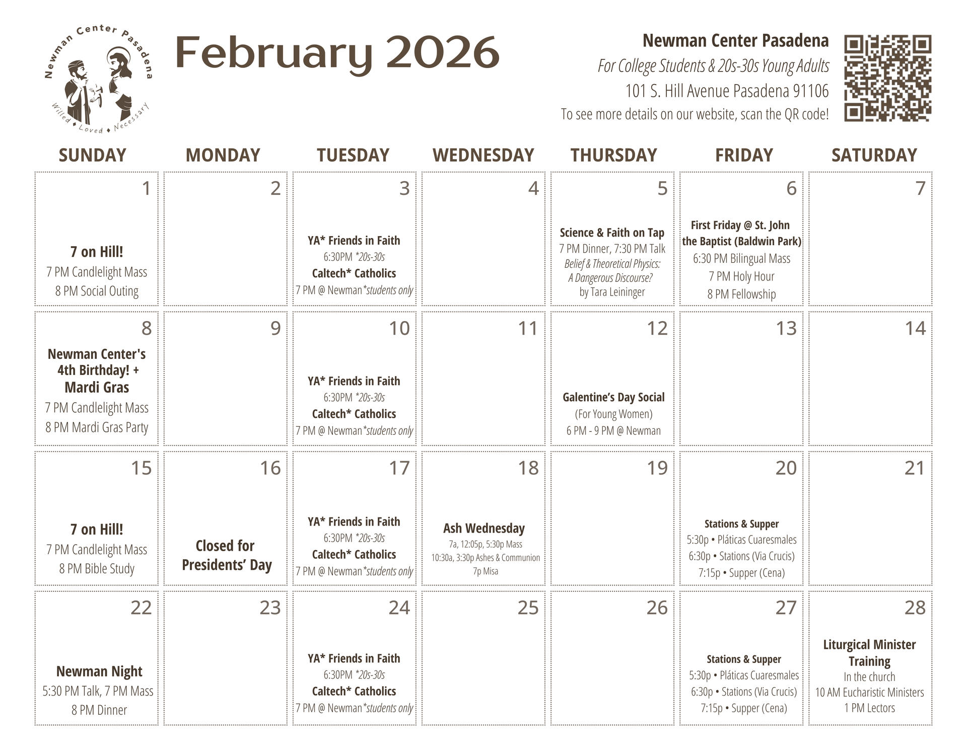 Join us every last Sunday of the month (with some exceptions) for a 5:30 PM presentation, 7 PM Mass, and 8 PM Dinner. Visit our YouTube channel to watch livestreams from previous speakers.